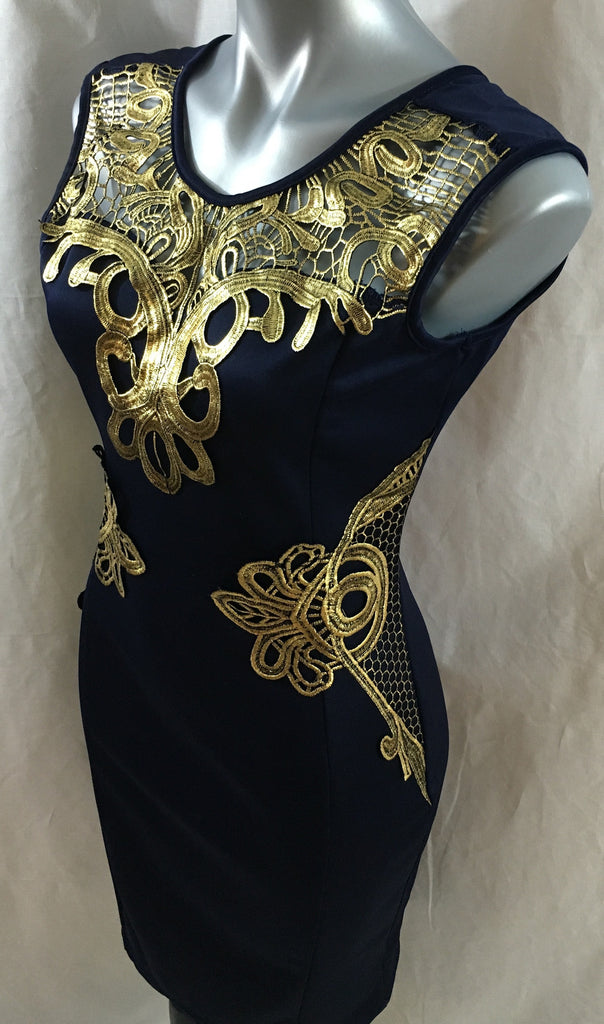 Elegant Navy Blue Dress With Gold Scroll Design Applique Star Fashion1
